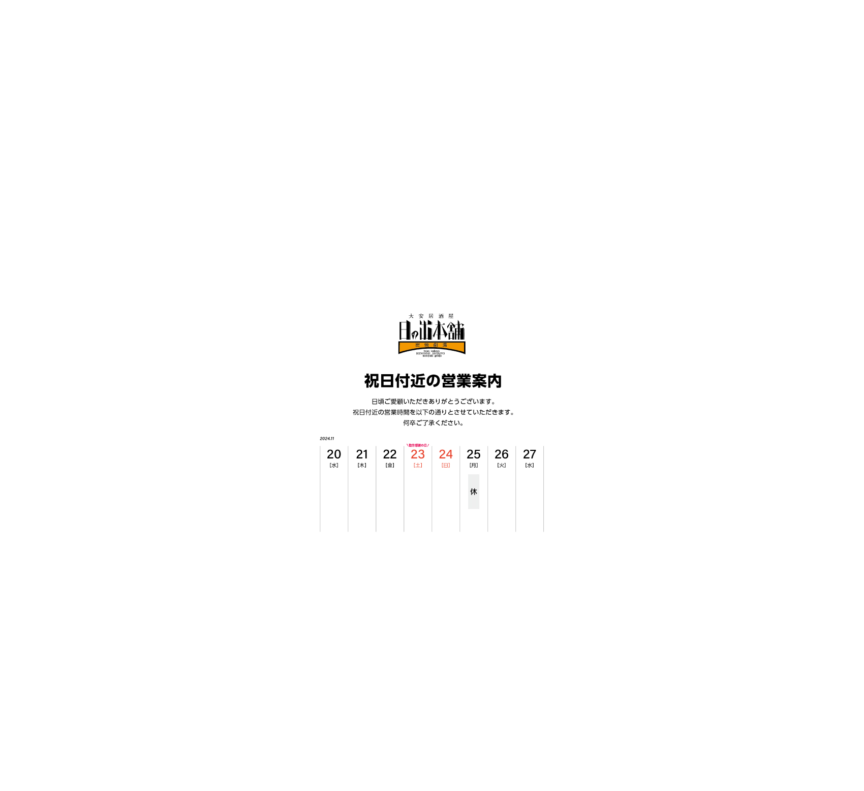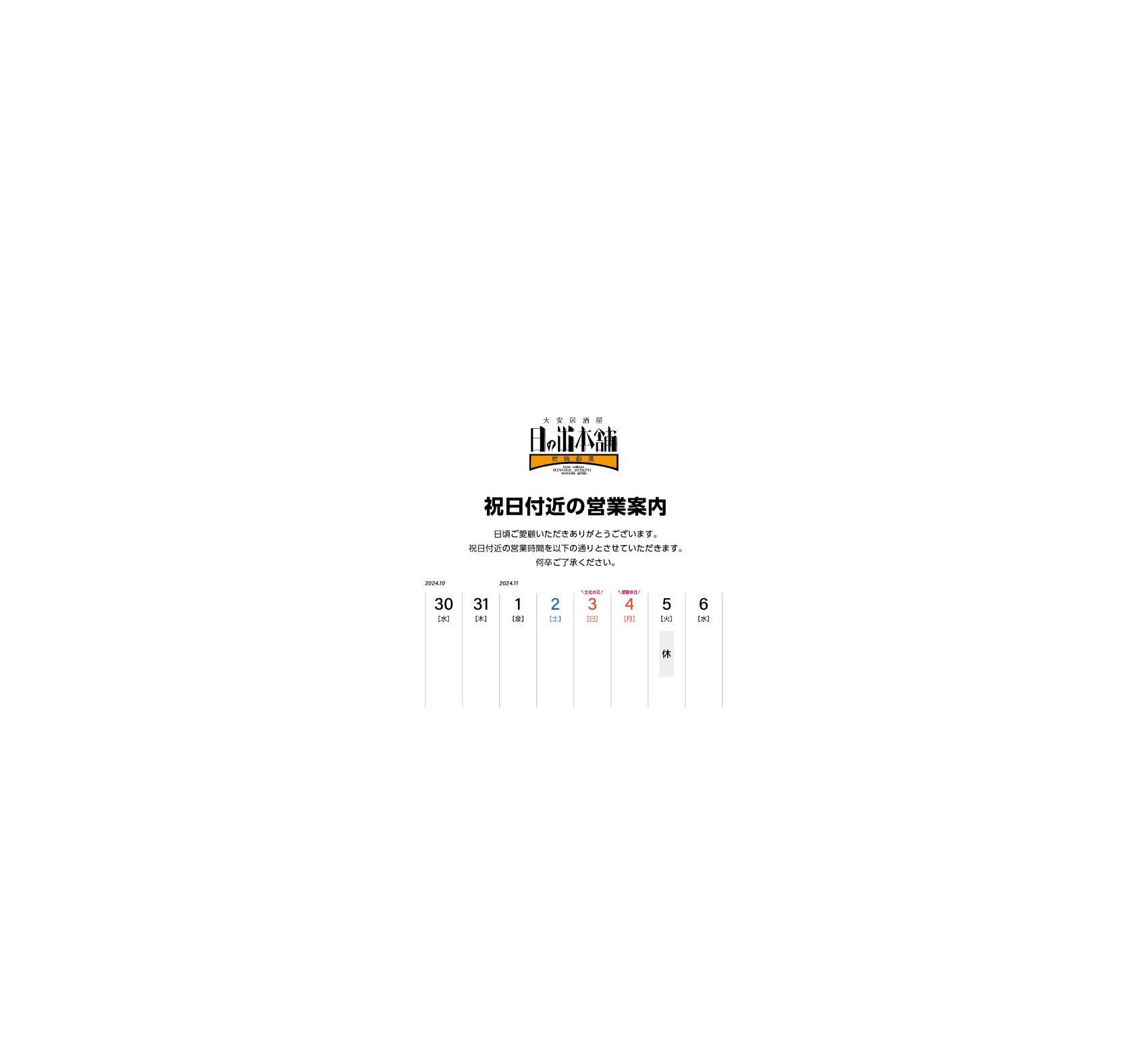 いつもサイトをご覧いただきありがとうございます。11月の祝日「文化の日」を含むカレンダーをご用意いたしました。当店の営業についてご案内です。 定休日が月曜ですが祝日のため、5日(火)にお休みをいただき、他の日にちは通常営 […] -